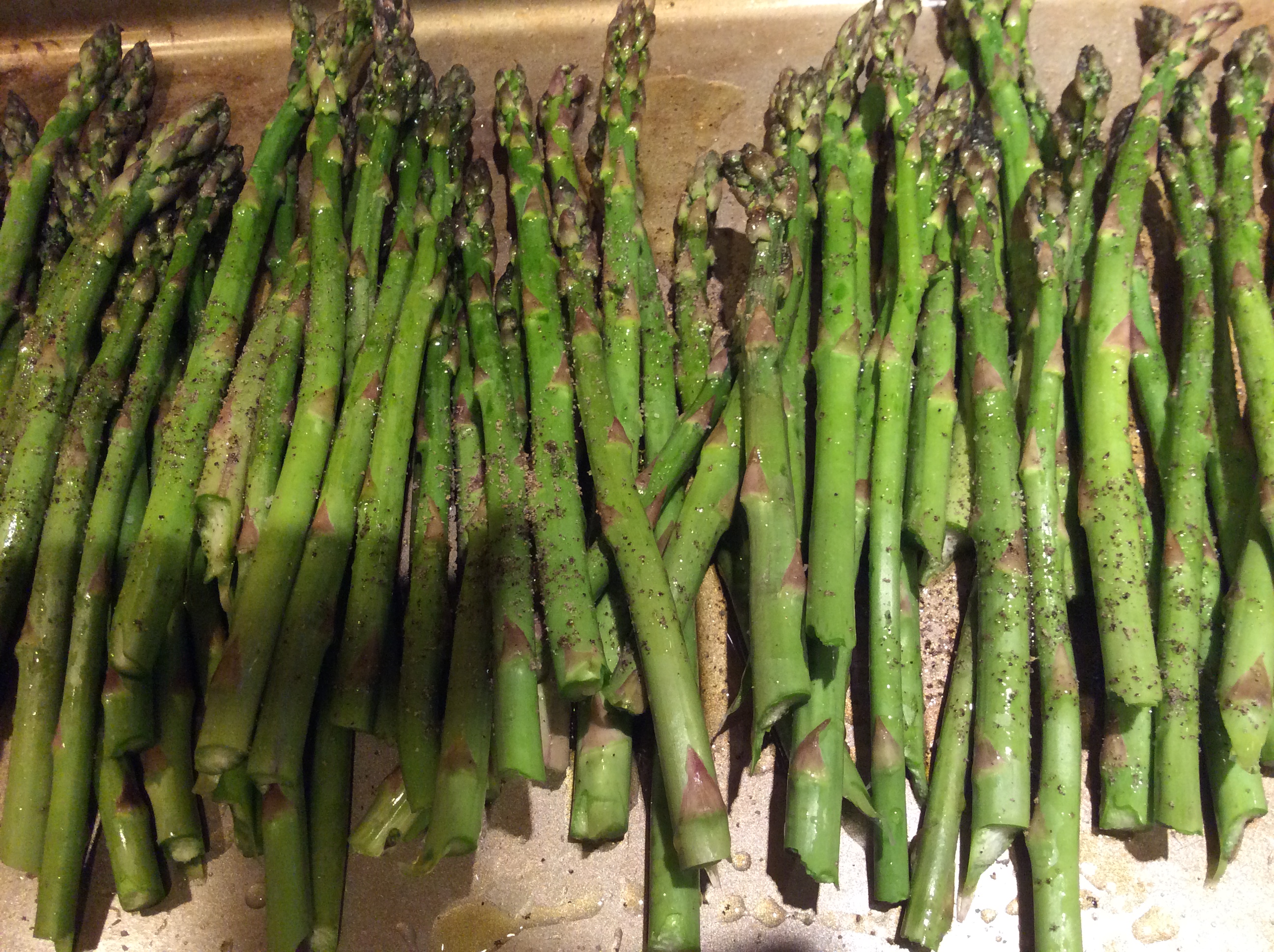 2. After preparing the asparagus by washing and cutting off the tough ends, dry well and spread out on a baking sheet.