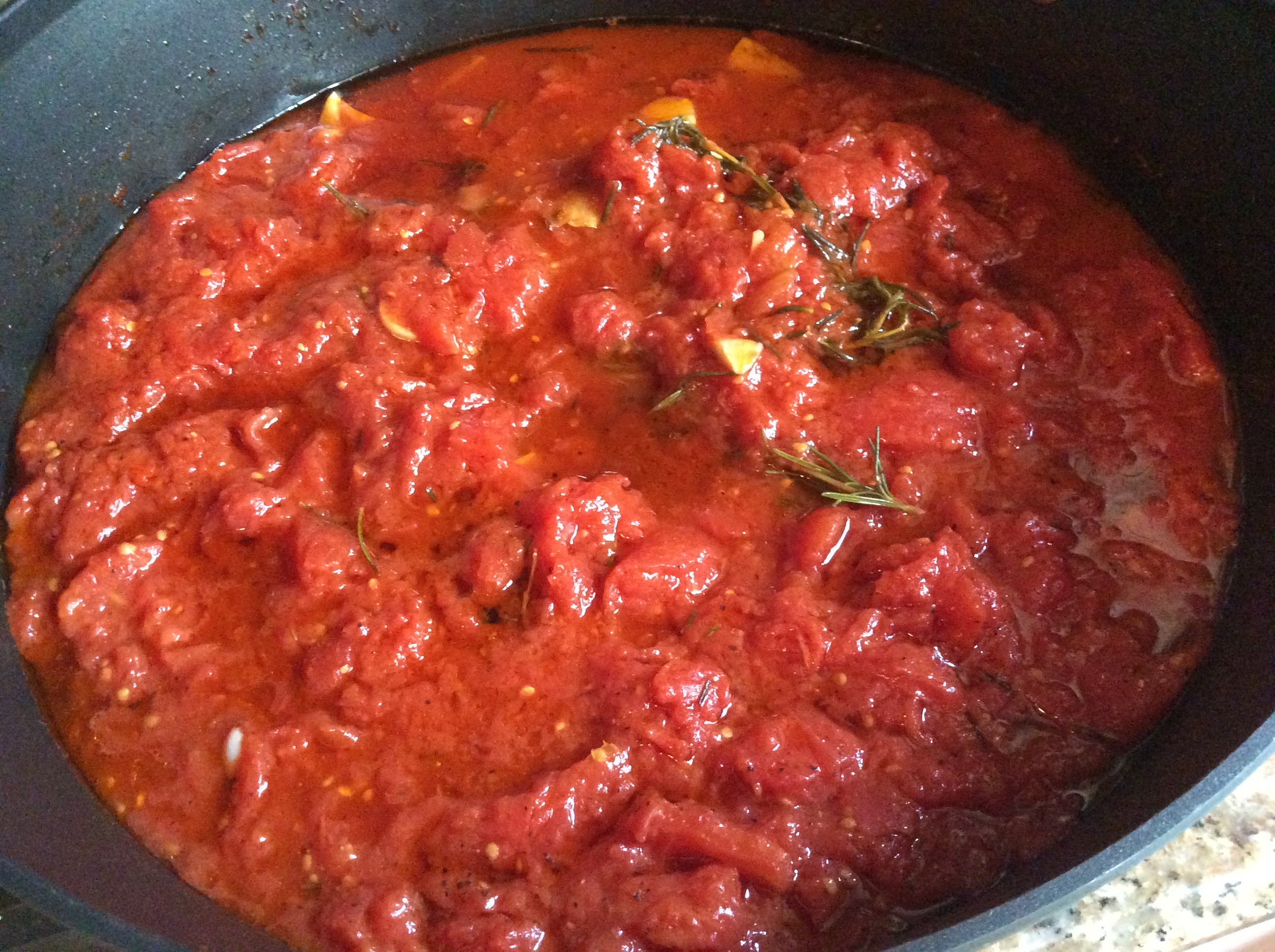 2.  As soon as the garlic comes to a sizzle, add the tomatoes, salt and liberal grindings of pepper.  If using dried rosemary (please tell me your’e not),  add it now.