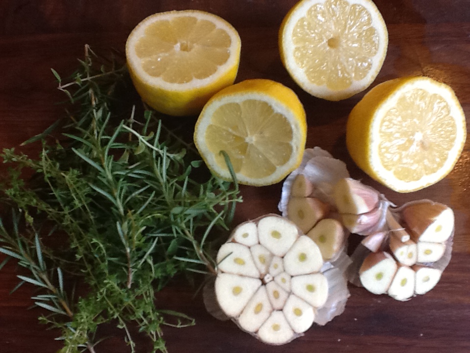 - Stuff the cavity (cavities) with the thyme, rosemary, both halves of the lemon, and all the garlic. Tie the legs together with kitchen string.
