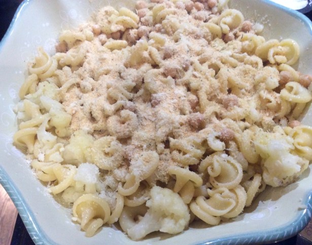 5. Put pasta and cauliflower in a large serving bowl.  Add the chick peas.  Toss well.