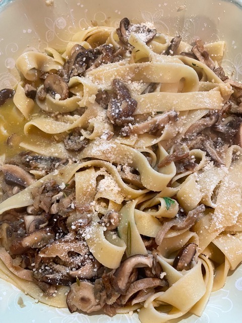 - Drain the pasta and toss it in the pan with the mushrooms. (You may have to divide the sauce and the pasta into two batches to do this). I didn’t. Turn off the heat, add one cup of the Parmigiano, and toss it through the pasta. to serve, transfer the pasta to a platter and top with the remaining Parmigiano and the parsley.