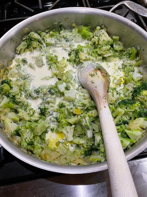 3. (While the pasta is cooking I did these next 3 steps). In a large saute pan, heat the olive oil over medium heat. Add the onion and saute until tender and golden, about 5 minutes. Add the garlic and cook for another minute. Add the broccoli and season with salt and pepper. Pour the cream over the mixture. Cook for 15 seconds and remove from the heat.