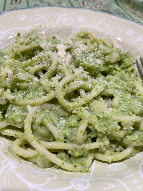 ** NOTE: I made sure the broccoli sauce was ready before I drained the pasta so the pasta wouldn’t clump together in the pot. Also, I tossed the pasta after adding the cheese at the end, to mix it in so it would cling to each strand of spaghetti. Then I added a bit more, “scattered” on top and passed Parmesan cheese at the table.
