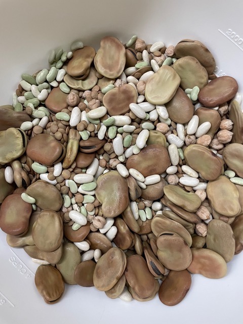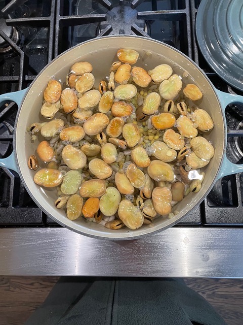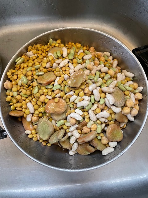 **NOTE: While the quantity of legumes is important ( total of 3 1/2 cups), use what you have on hand (clean out your pantry), EXCEPT please use 1 cup of fava beans. It really makes a difference.