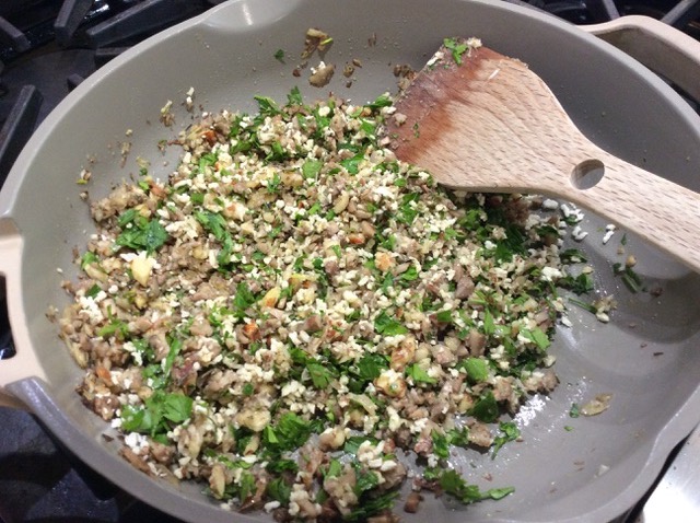 4. Toss the mushroom caps with olive oil. Fill each mushroom with the stuffing. Sprinkle grated Pecorino cheese over each mushroom and bake for 20-25 minutes, until the cheese browns a little and the mushrooms are warmed through.