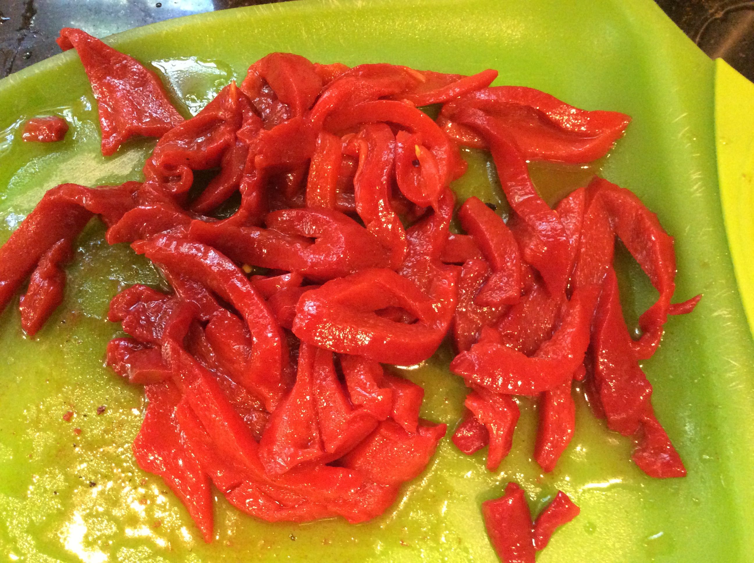 - Remove the stem from each pepper and cut them in quarters. Remove the skins and the seeds and put in a bowl. You can slice them thinner if you like.