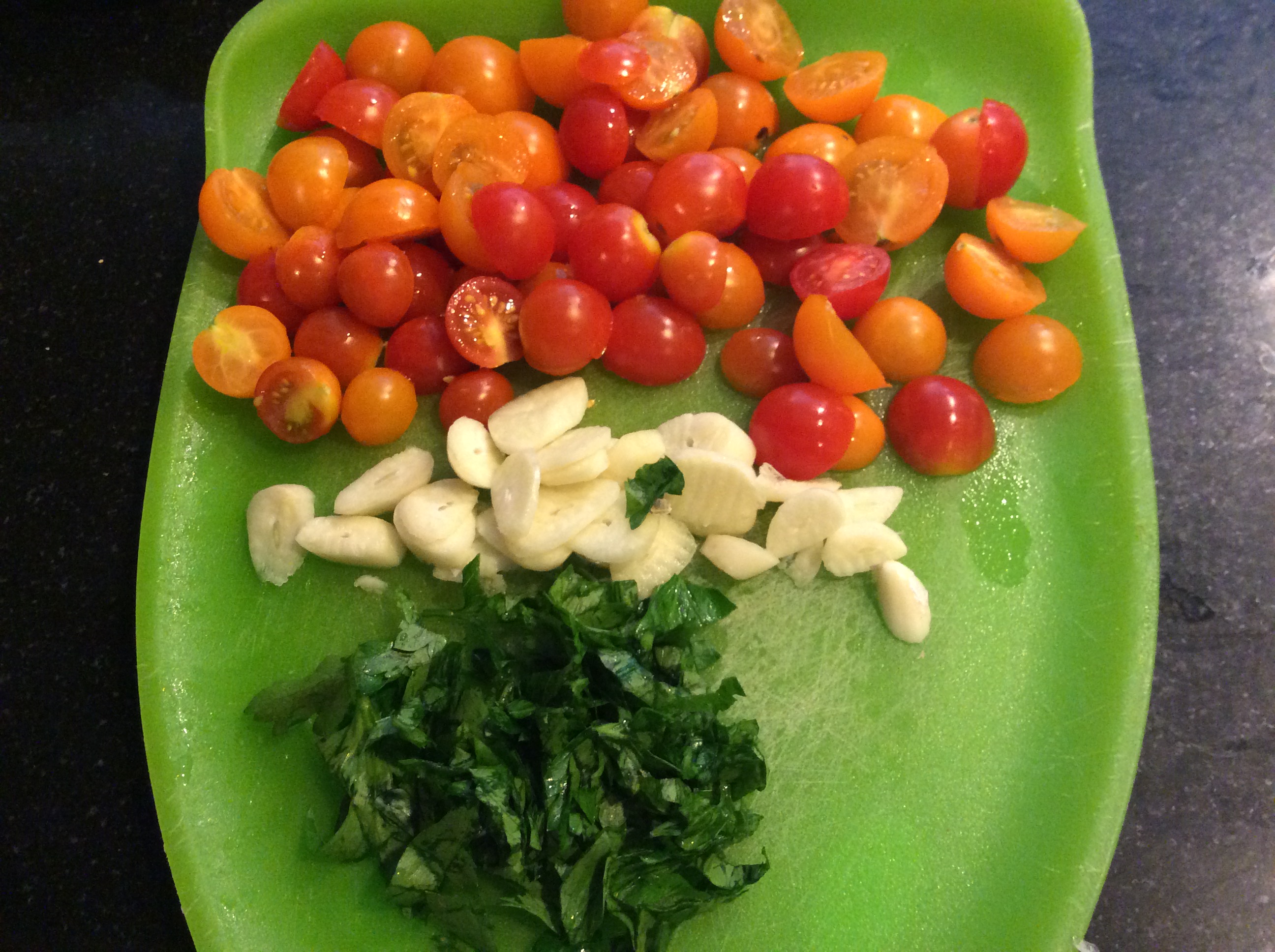 1 quart cherry tomatoes, halved ( I like to use red and yellow or orange)