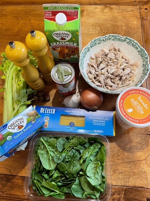 Stir in the milk and cream, chicken and nutmeg. cook for 2 minutes. Add the pasta and cook for 1 minute or until the pasta is just al dente. Taste for seasoning. Stir in the spinach and remaining butter and serve.