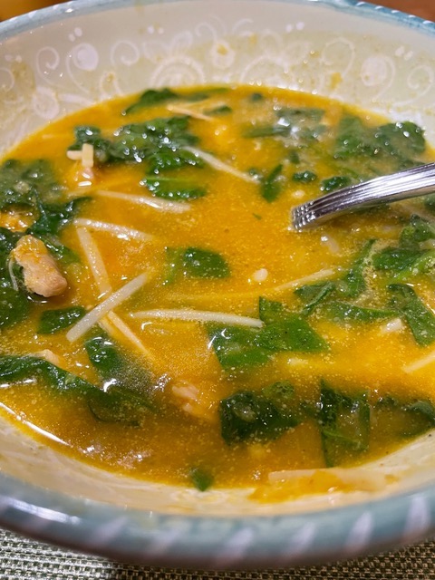 However, when she told me the ingredients, and that it came from an Italian cookbook, I was skeptical. Chicken, pureed pumpkin, cream, spinach, pasta……it didn’t sound very Italian to me, nor had I ever heard of an Italian soup like this. But this is my friend who never disappoints when she tells me a recipe is good……not in over 35 years. I asked for the recipe, and a picture of the cookbook that it came from, as I was curious.